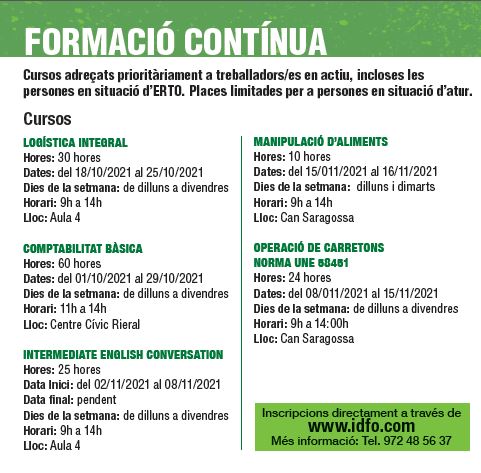 Cursos adreçats prioritàriament a treballadors/es en actiu, incloses les persones en situació d'ERTO. Places limitades per a persones en situació d’atur.