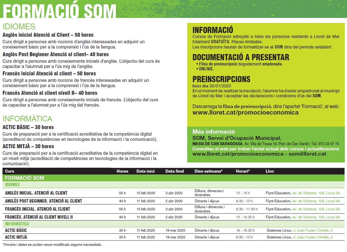 Cursos de Formació adreçats a totes les persones residents a Lloret de Mar totalment GRATUÏTS. Places limitades. Les inscripcions hauran de formalitzar-se al SOM dins del període establert.