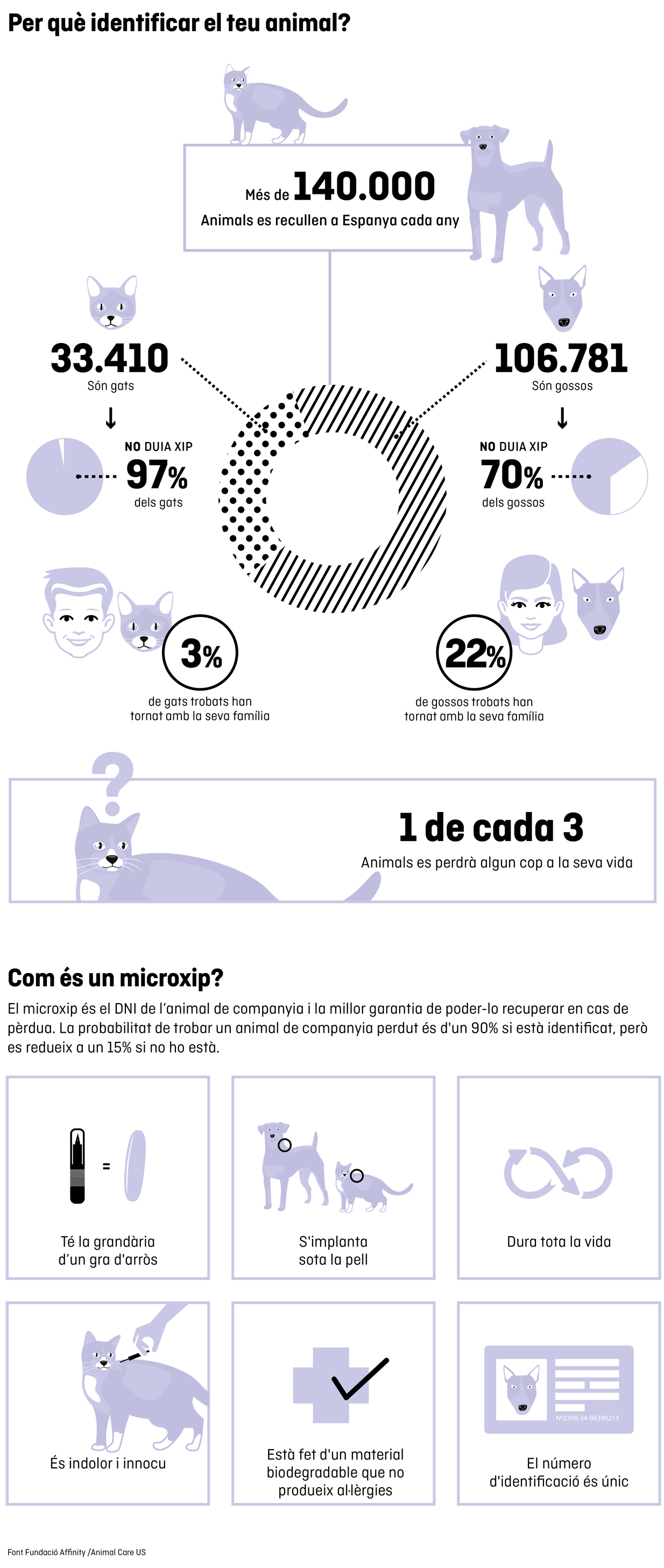 - Reduir l’abandonament i ajudar a optimitzar els recursos destinats a l’administració pública i les entitats protectores privades, evitant recollides d’animals perduts i abandonats